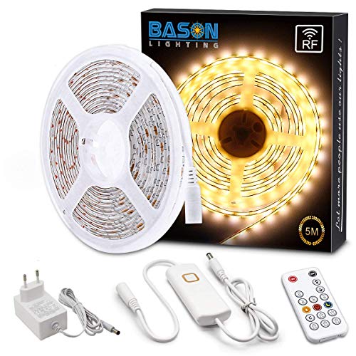 BASON Striscia LED da 5 m, dimmerabile, luce bianca calda, 3000 K, striscia LED con alimentatore di rete, autoadesiva, kit fai da te per cucina, camera da letto, scale