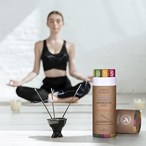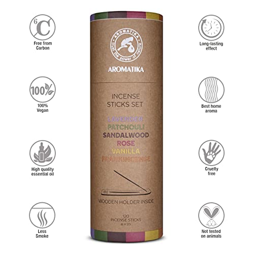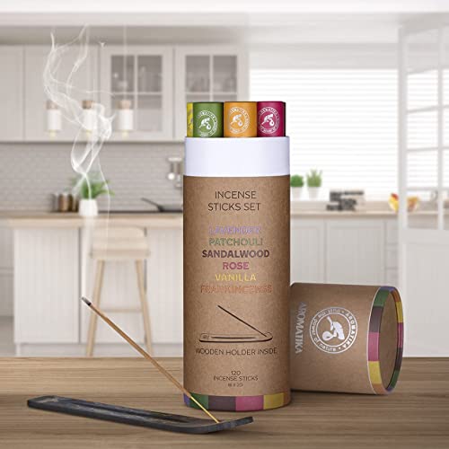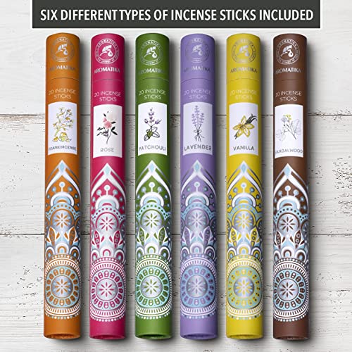 Set di Bastoncini Incenso - Porta Incenso - Bastoncini di Incenso in Set da 120 Pezzi con 6 Fragranze - Lavanda - Patchouli - Legno di Sandalo - Rosa - Vaniglia - Incenso - Accessori per Affumicatura