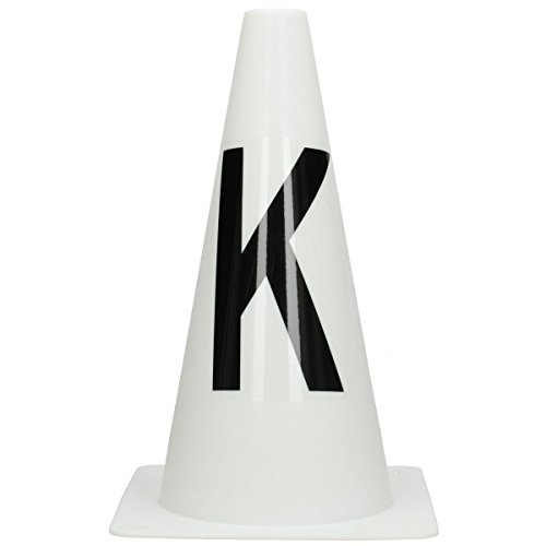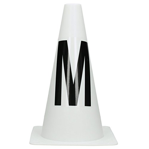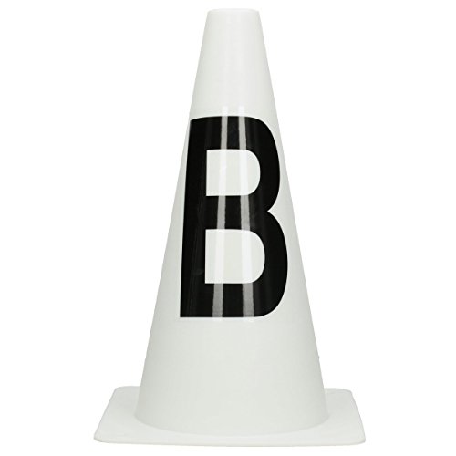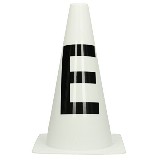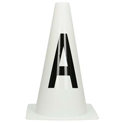 8 piloni in plastica con piedistallo bianco con scritta nera.