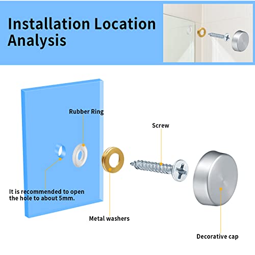【★ Installazione e applicazione】 Basta praticare un foro da 3-5 mm nel vetro, installare la rondella di plastica morbida e la rondella di rame in sequenza, quindi serrare le viti e infine installare il coperchio decorativo. Le viti per specchi e le coperture per specchi possono essere ampiamente utilizzate all'interno o all'esterno, come specchi, tavolini da caffè, pannelli del bagno, armadi, insegne e altri mobili in legno o vetro.