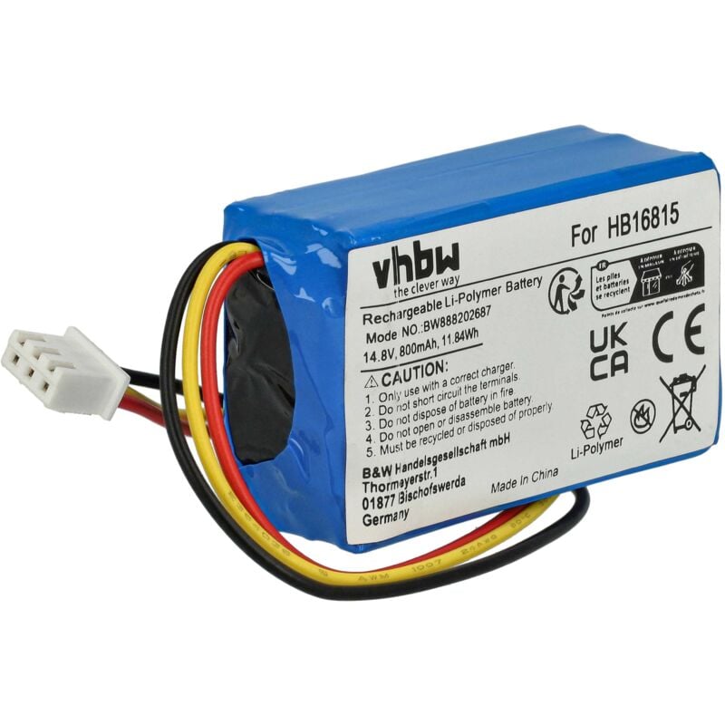 Vhbw - the clever way - Batteria ricaricabile di ricambio, compatibile e di alta qualità, ad alta capacità, per robot per pulire le finestre o robot / dispositivo per la pulizia della casa (Può trovare tutti i modelli corrispondenti qui di seguito) - Le nostre batterie ricaricabili soddisfano tutti i requisiti rilevanti per la sicurezza operativa CONTENUTO DELLA SPEDIZIONE: - 1x batteria ricaricabile SPECIFICHE TECNICHE: - Tecnologia: Li-Ion - senza effetto memoria - Capacità: 800 mAh - Tensione: 14,8 V - Energia: 11,84 Wh - Numero di celle: 4 COMPATIBILE CON: - Hobot 168 - Hobot 188 - Hobot 198 - Hobot 268 - Hobot 288 Per garantire la compatibilità, verificare se la batteria ricaricabile attualmente in uso è presente nell'elenco. SOSTITUISCE: - Hobot HB16815 vhbw - Accessori e pezzi di ricambio di alta qualità. Per prolungare la durata di vita dei Suoi apparecchi elettrici.
