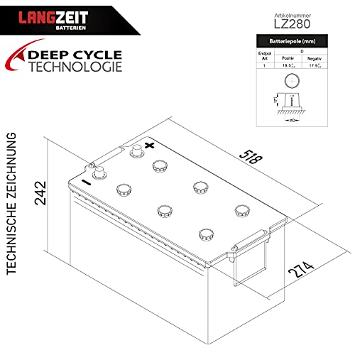 Batteria a energia solare 280 Ah 12 V C100 di lunga durata, oltre 600 cicli carico/scarico secondo DIN.