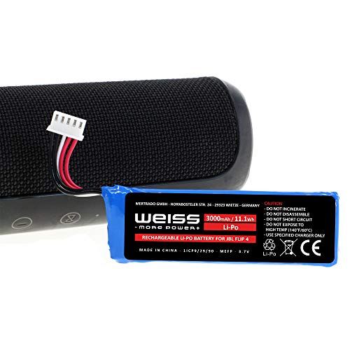 Contenuto della confezione: 1 batteria per JBL Flip 4, JBL Flip 4 Edizione Speciale 3000mAh 3.7V Batteria di ricambio ai polimeri di litio compatibile con GSP872693 01, batteria di ricambio per altoparlante Bluetooth JBL JBL JBL - Carillon ricaricabile Weiss More Power