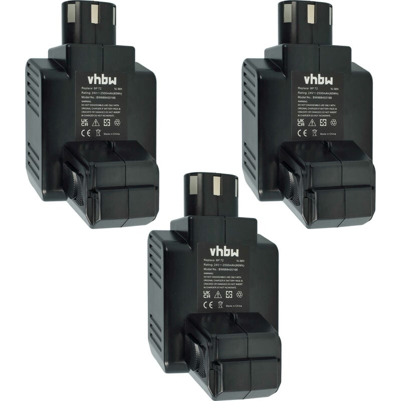 Vhbw - the clever way - Batteria ricaricabile di ricambio, compatibile e di alta qualità, ad alta capacità, per strumenti da lavoro come trapani, levigatrici, smerigliatrici, avvitatori elettrici, reggiatrici, radio, seghe e tagliaerba - È adatta anche come batteria di riserva - Le nostre batterie soddisfano tutte le principali norme di sicurezza operativa Accessorio compatibile di alta qualità ad alte prestazioni di vhbw. CONTENUTO DELLA SPEDIZIONE: - 3x batteria SPECIFICHE TECNICHE: - Tecnologia: NiMH - Capacità: 2500 mAh - Tensione: 24 V - Energia: 60 Wh - Colore: nero - Numero di celle: 20 Per garantire la compatibilità, verificare se la batteria ricaricabile attualmente in uso è presente nell'elenco. SOSTITUISCE: - Hilti BP72 Accessori e pezzi di ricambio di alta qualità. Per prolungare la durata di vita dei Suoi apparecchi elettrici.