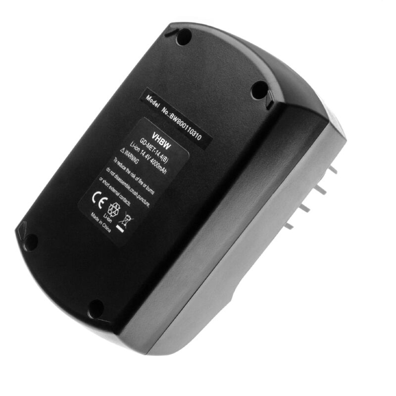 Vhbw - the clever way - Batteria ricaricabile di ricambio, compatibile e di alta qualità, ad alta capacità, per strumenti da lavoro come trapani, levigatrici, smerigliatrici, avvitatori elettrici, reggiatrici, radio, seghe e tagliaerba - È adatta anche come batteria di riserva - Le nostre batterie soddisfano tutte le principali norme di sicurezza operativa Accessorio compatibile di alta qualità ad alte prestazioni di vhbw. CONTENUTO DELLA SPEDIZIONE: - 1x batteria SPECIFICHE TECNICHE: - Tecnologia: Li-Ion - senza effetto memoria - Capacità: 4000 mAh - Tensione: 14,4 V - Energia: 57,6 Wh - Colore: nero Per garantire la compatibilità, verificare se la batteria ricaricabile attualmente in uso è presente nell'elenco. SOSTITUISCE: - Metabo 6.25475, 6.25476, 6.25482, 6.25481, 6.25482.00 Accessori e pezzi di ricambio di alta qualità. Per prolungare la durata di vita dei Suoi apparecchi elettrici.