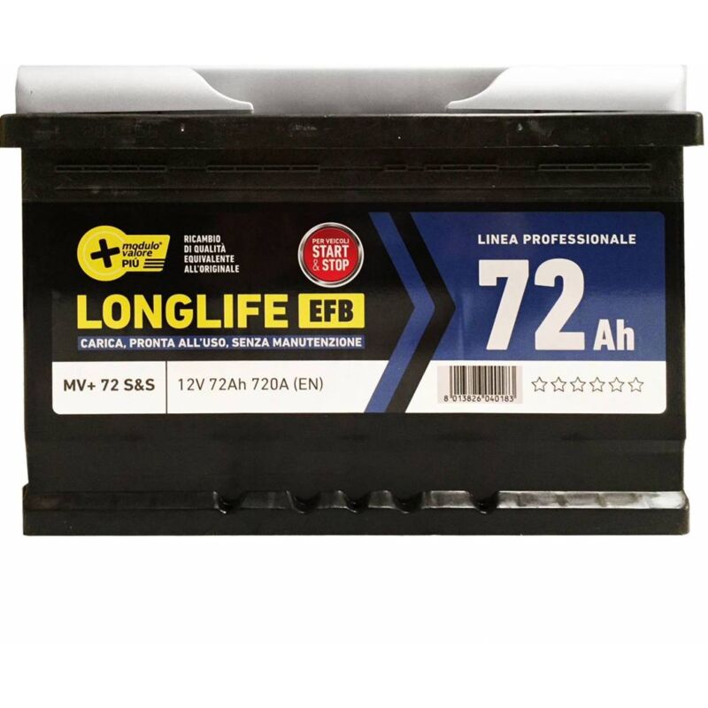 Mod. longlife progettate appositamente per i veicoli dotati di tecnologia start stop. polarit a destra. voltaggio 12v. capacit 72 ah. corrente avviamento a freddo 720a. dimensioni 275 x 175 x 190 mm. peso batteria 5 17,6 kg.