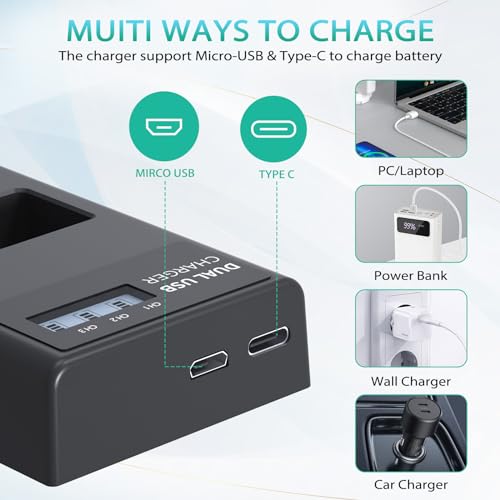 Caricabatterie veloce: il caricabatterie LP LP-E6 può caricare tre batterie contemporaneamente da dispositivi Micro-USB e di tipo C come laptop, caricabatterie da auto, caricabatterie da parete e power bank ovunque tu vada. Ideale per viaggi, campeggio, altre attività all'aperto e al chiuso. L'ingresso da 5 V 2,1 A migliora l'efficienza di ricarica e richiede solo 4 ore per caricare completamente 2 batterie contemporaneamente. Ogni slot di ricarica funziona in modo indipendente.