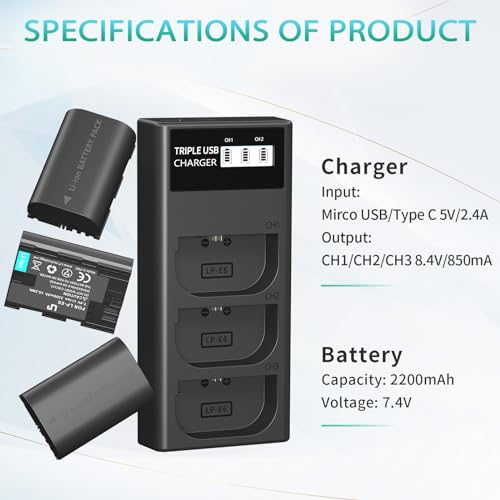 LP -E6 LP E6N Battery Charger Pack, LP 3-Pack Batteria e Triple Slot Charger Compatibile con Canon EOS 90D, 80D, 70D, 60D, 60DA, 7D Mark II, 7D, 6D Mark II, 6D, 5D Mark IV, 5D Mark III, R, R5