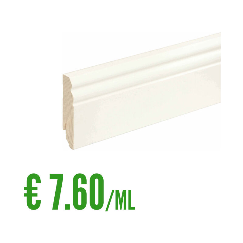 Battiscopa Legno Bianco RAL 9016 realizzato con vero legno massello . Produzione austriaca di alta qualit a prezzo di fabbrica: il battiscopa legno bianco anche certificato FSC e PEFC ! Il Battiscopa Legno Bianco ha superficie laccata opaca (NON lucida) e disegno stile ducale inglese . La fresatura del battiscopa permette il passaggio di piccoli cavi elettrici . DIMENSIONI Spessore 18 mm Altezza 80 mm CONFEZIONE RISPARMIO da 24 ML: 10 aste di lunghezza 2,4 metri. POSA La posa del Battiscopa Legno Bianco avviene in maniera molto semplice con colla, chiodini o Clip CH 23 acquistabili nella sezione Accessori. MANUTENZIONE Una prolungata esposizione della superficie all'acqua pu causare danni permanenti al prodotto. Per la pulizia utilizzare un panno leggermente umido, ben strizzato, e un detersivo con pH inferiore ad 8. Vuoi ordinare un CAMPIONE del Battiscopa Legno Bianco? Aggiungilo direttamente al carrello dalla sezione Accessori oppure Clicca QUI . ML Confezione 24 Prezzo/ml 7.6000
