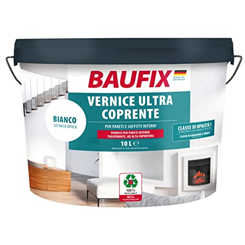 Baufix Colore ultra coprente bianco, satinato, 10 litri, colore da parete, per interni, elevata opacità, colore interno con opacità classe 1