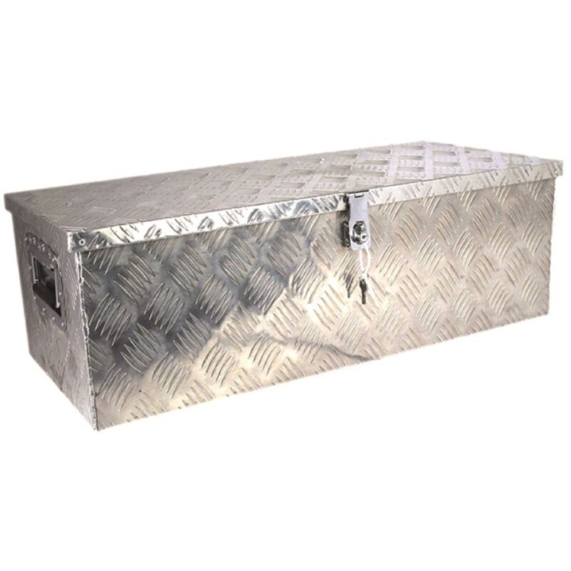 Baule portattrezzi in lamiera d'alluminio mandorlata con 2 maniglie per trasporto di utensili, chiusura centrale anteriore con chiave, volume 62 lt. Dimensioni 76x33,5x24,5 cm.