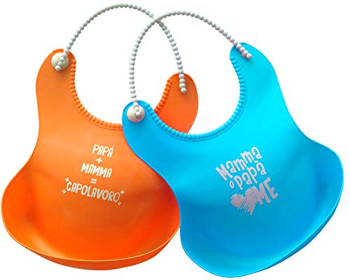 Bavaglini neonato in silicone | Impermeabili, Facili da pulire | Tasca Raccogli Cibo | Set 2 bavaglini in silicone per bambini e neonati | (Azzuro, Arancione)