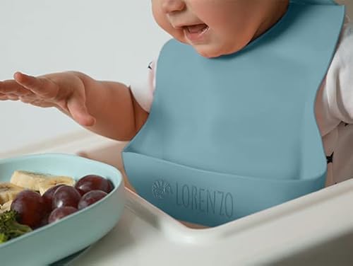 Bavaglino in silicone personalizzato con nome - Stellasticker - Testo inciso nel silicone ultra resistente e vasca raccogli cibo. Resistente in lavastoviglie (Blu oceano)