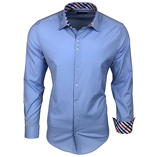 Baxboy 501 Camicia da uomo a quadretti, da uomo, con collo alto, a maniche lunghe, per il tempo libero, Azzurro, S