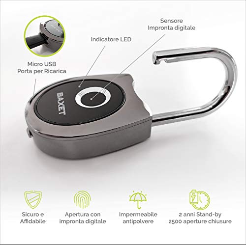 BAXET - Lucchetto a Impronta Digitale | Lucchetto antifurto Senza Chiave | Impermeabile Ricaricabile USB | Bagaglio | Armadietto in Palestra | Bici | Moto | Serratura | Senza codice ne Chiavi