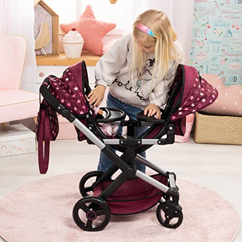 Bayer Design 26723AA Carrozzina gemellare Twin Xeo, carrozzina per bambole doppia, regolabile in altezza, borsa, bordeaux, rosa, stelle