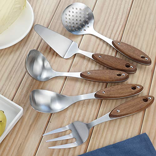 Gli utensili da cucina comprendono: mestolo per zuppa, spatola wok, spatola scanalata, cucchiaio per spaghetti, cucchiaio solido, cucchiaio scanalato, schiumarola, cucchiaio, forchetta per carne, spatola solida