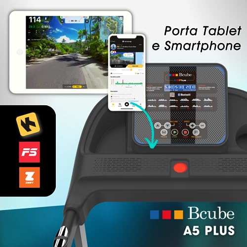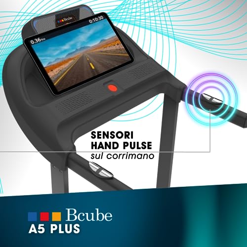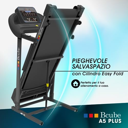 Bcube A5Plus Tapis roulant elettrico, Prodotto italiano, Velocità 16 km/h, 15 livelli di inclinazione, Bluetooth, App Kinomap, Fitshow e Zwift, Richiudibile salvaspazio, Hand pulse