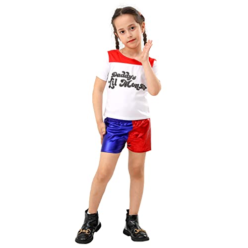Bdwing Harley Quinn Suicide Costume per Ragazze Bambina, Costume Outfit del Vestito kit Cappotto, Maglietta, Pantaloncini per 2 3 4 5 6 7 8 9 anni Bambini (s-105-120cm)