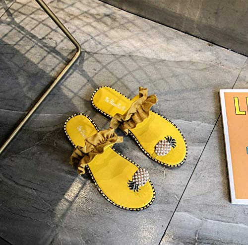 Beach Slippers for Women Summer, Girls Toe Loop Sandal,Fashion Pineapple Pearls Clip Toe Flip Flops (Yellow, numeric_38)