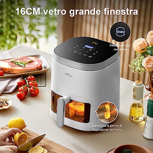 【Vetri espositivi + luci antideflagranti】Le nostre friggitrice a aria hanno Il design di illuminazione visiva da 16 cm/6,3 pollici consente una visibilità completa durante tutto il processo di cottura, rendendo facile aggiungere ingredienti e regolare la temperatura regolarmente.