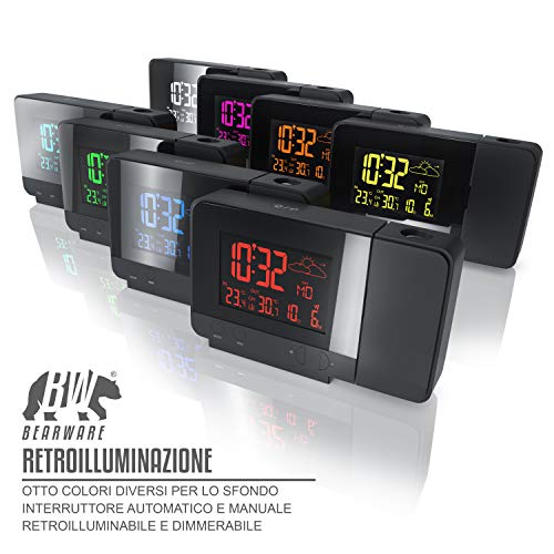 Bearware - Stazione Meteo e sveglia Senza Fili con proiezione a muro e sensore Esterno - Orologio DCF - Presa USB - 2 Allarmi - Display a 8 COLORI - Previsioni meteo - Con batteria anti black out