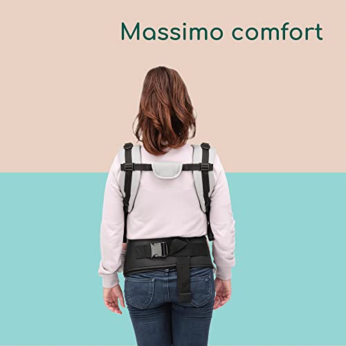 Comfort ottimale anche per il genitore grazie a spallacci imbottiti per evitare escoriazioni e ampia cintura in vita per distribuire il peso del bambino