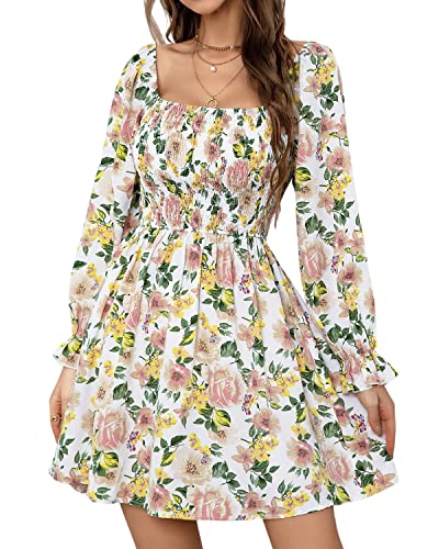 BebreezChic Vestito Donna Mini Estivo Floreale Manica Lunga Scollo Quadrato Pieghetto Dress Elegante, Bianco, XL