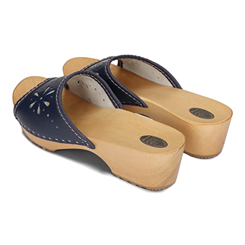 BeComfy - Zoccoli da Donna - Zoccoli Comodi per la Casa e Il Giardino con Suola in Gomma/Legno - Pelle Naturale - Nero, Bianco, Rosso, Fiori 36 37 38 39 39 40 41 (41 EU, Blu Scuro)