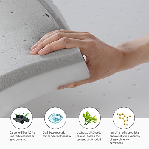 【Memory foam con l'infuso】 Infuso di Carbone di bambù/Tè verde/Gel/Ioni di rame aiutano ad assorbire e disperdere il calore corporeo per regolare la temperatura e mantenerti fresco più a lungo, questo materasso topper imbottito in memory foam di alta qualità è l'ideale per garantire una notte di sonno rilassato.