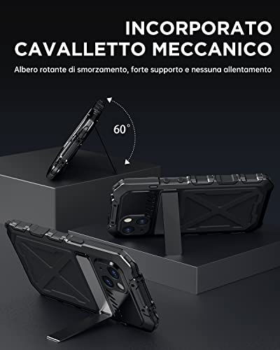 【Cover Blindata per iPhone 14 (6,1 pollici)】 [Serie Powerful] Custodia con protezione per lo schermo in vetro temperato 9H e supporto nascosto in metallo. La robusta struttura in metallo e il silicone ammortizzante offrono una protezione completa del corpo.
