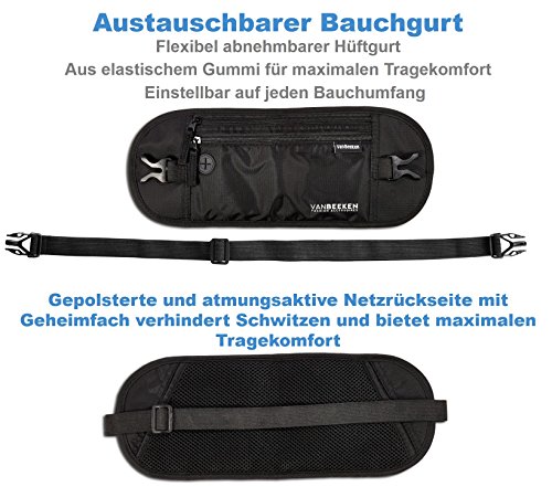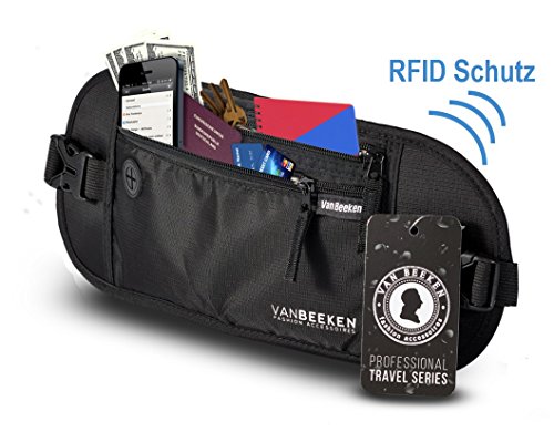 Van Beeken - Cintura unisex per denaro da viaggio - con blocco RFID - Marsupio piatto - 37 x 14,5 cm, Nero, taglia unica, Cintura per banconote