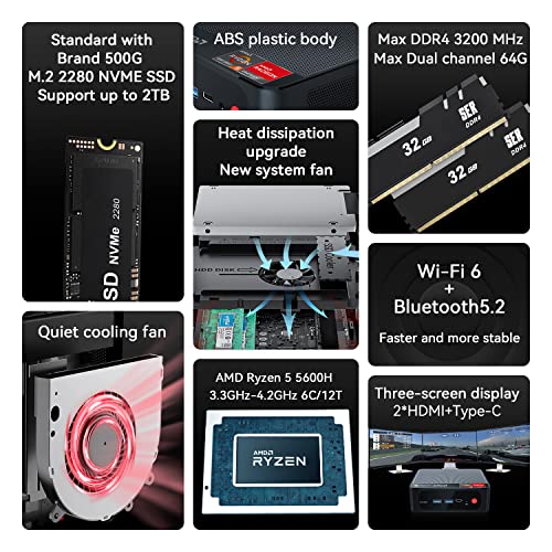 Beelink SER 5600H - Mini PC con Windows 11 Pro, 6-Core Ryzen 5 5600H, RAM 32 GB DDR4 3200, SSD NVMe 500 GB, Slot SATA3, Wi-Fi 6E AX, Gigabit Ethernet, Bluetooth 5.2, fino a 3 Monitor 4K