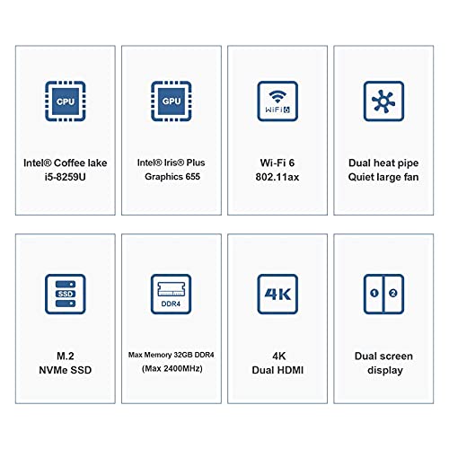 [Quad Core Intel Core i5] Mini PC con processore Intel Core i5-8279U di ottava generazione (2.4 GHz, Turbo fino a 4.1 GHz, 4 Core, 8 Thread, supporto 6 M Intel Smart Cache, 14 nm) e sistema operativo Windows 11 Pro. Il potente processore garantisce prestazioni elevate in grado di soddisfare moltissimi scenari di utilizzo rendendo questo dispositivo lo strumento perfetto per l'intrattenimento multimediale e la navigazione Web quotidiana, oppure un'efficiente postazione di lavoro valida sia per l'ufficio che per la casa.