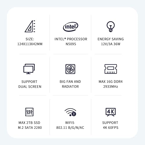 Beelink U59 - Mini PC a basso consumo energetico, Windows 11 Pro, Intel Celeron N5095, UHD 4K, RAM 16 GB DDR4, SSD 512 GB, Wi-Fi 5 AC, Gigabit Ethernet, Bluetooth, 2x HDMI, VESA, GARANZIA ITALIANA