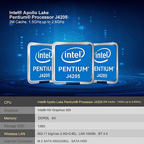 [Processore J4205] Dotato di CPU Intel Apollo Lake Pentium J4205 (2M Cache, 1,5 GHz fino a 2,6 GHz), offre un perfetto equilibrio tra velocità di marcia, temperatura, prestazioni e silenzio assoluto.
