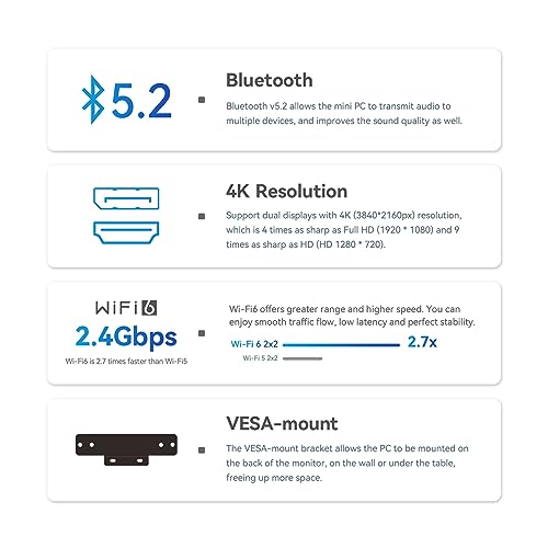⚡【Wifi 6 e porte multiple】Il micro PC è dotato di WiFi6 a doppia banda (802.11ax), BT5.2 e una porta LAN 1000M, che consente una trasmissione dati più veloce e stabile. Questo mini PC offre varie porte per la connettività, tra cui 1*HDMI2.0, 1* DP, 2* USB3.2, 2* USB2.0, 1* Type-C e 1* porta Jack audio da 3,5 mm (HP&MIC), che supporta molteplici modalità di connessione delle periferiche.