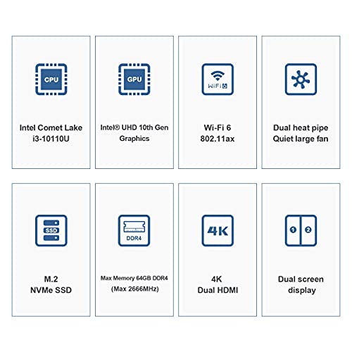 [Dual Core Intel Core i3] Mini PC con processore Intel Core i3-10110U di decima generazione (4.1 GHz, 2 Core, 4 Thread, 14 nm) e sistema operativo Windows 10 Pro. Il processore garantisce prestazioni in grado di soddisfare moltissimi scenari di utilizzo rendendo questo dispositivo lo strumento perfetto per l'intrattenimento multimediale e la navigazione Web, oppure un'efficiente postazione di lavoro valida sia per l'ufficio che per la casa.