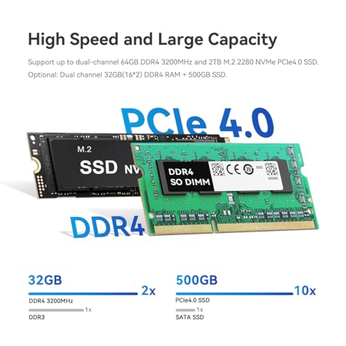 ✅Alta capacità ed espandibile: il mini computer SEi12 è dotato di 32 GB di RAM e SSD PCIe 4.0 NVMe da 500 GB. Dual Channel DDR4 può essere configurato a 64 GB 3200 MHz. E puoi espandere la memoria con l'interfaccia SSD M.2 2280 NVMe fino a 2TB (escluso) e tramite SATA3 HDD (2.5 in 7 mm) fino a 2TB (escluso).