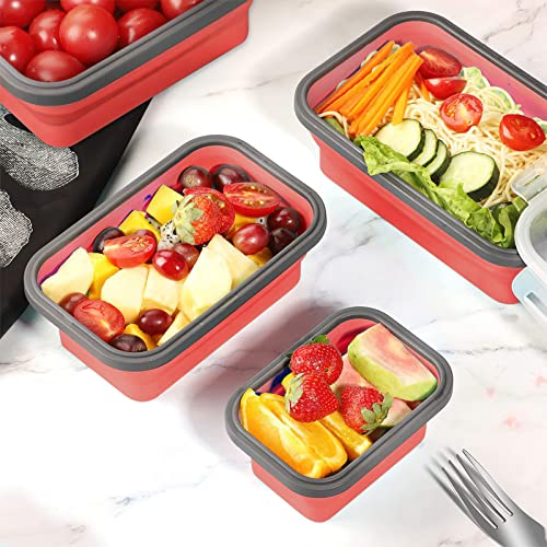Beeptrum Contenitore per alimenti in silicone pieghevole con coperchio, portatile, salvaspazio, adatto al microonde, lavastoviglie e congelatore, set di 4 (Rosso)