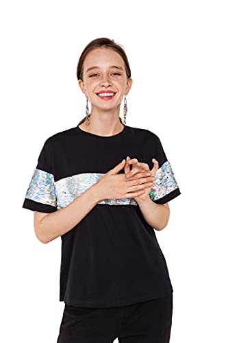Maglietta sciolta con paillette sulle maniche e sul petto. Scollo tondo, linea spalla scesa, manica corta.