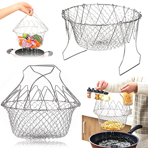 Behone 2 Pezzi Cestello per Friggere Pieghevole, Cestello Profondo per Frittura, Cestello per Friggere Colino per Colapasta Multifunzione per Patatine Fritte, Verdure, Insalate, Frutta