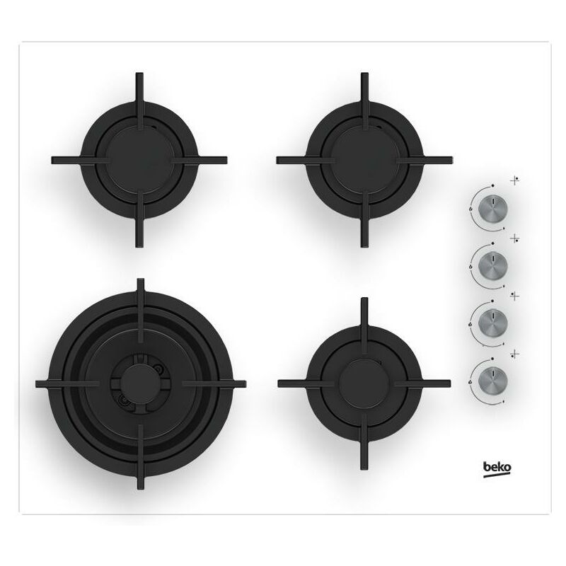 Piano di cottura a gas in vetro white con 4 bruciatori a gas da 3,3 kW, 1,75 kW, 1,0 kW, 1,75 kW, griglie in ghisa, manopole a destra, senza cornice, apertura del piano di cottura: 560 x 490 mm.