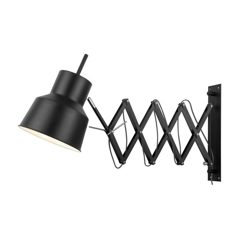 Lampada a parete in metallo laccato nero con braccio estensibile e paralume orientabile, cavo in tessuto con interruttore ON/OFF 1 lampadina E27 max 40W NON INCLUSA IP20 Lunghezza cavo elettrico 200 cm Dimensioni: L 53/96 cm, H 42 cm Dimensioni rosone a parete: L 8 cm H 42 cm