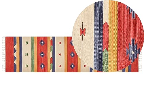 Beliani Tappeto kilim in cotone rosso beige con nappe 80 x 300 cm Alapars