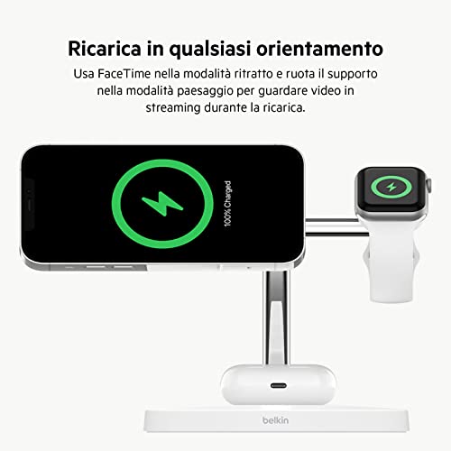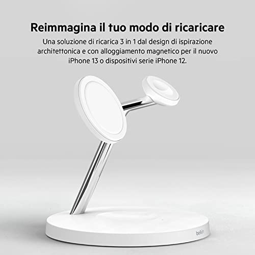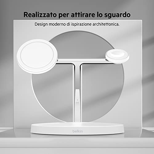 Belkin Caricabatterie wireless 3 in 1 con MagSafe, caricatore wireless rapida per iPhone (15 W) e per Apple Watch, stazione di ricarica per iPhone 15, 14, 13, 12, Apple Watch e AirPods - bianco
