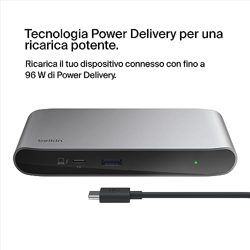 RICARICA INTELLIGENTE: l'alimentatore da 150 W mantiene i tuoi dispositivi carichi. L'hub all-in-one ricarica anche quando usi le altre porte, offre 96 W di Power Delivery e supporta 15 W di ricarica downstream da ogni porta.