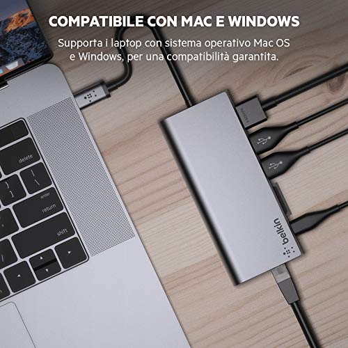 Belkin Hub Multimediale USB-C con Cavo USB-C Attaccato (Dock USB-C per Laptop Mac OS e Windows Dotati di USB-C, 1 Porta HDMI, 1 Porta Gigabit Ethernet)