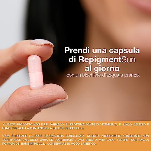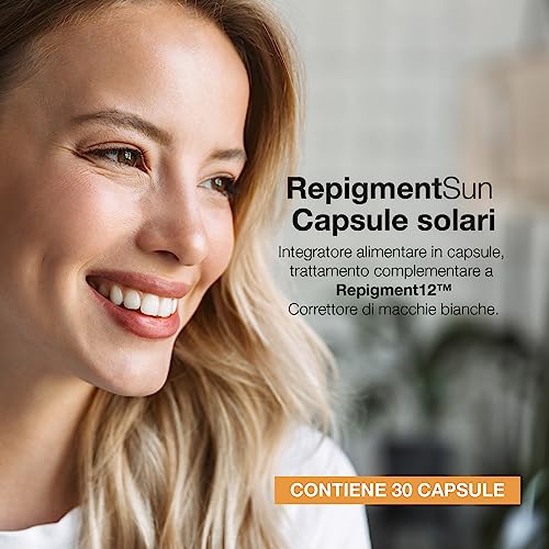 TRATTAMENTO: RepigmentSUN (30 capsule), le capsule solari che preparano la pelle all'esposizione al sole nel trattamento delle macchie bianche. Trattamento coadiuvante della crema Repigment12 Repigmenting. È un integratore alimentare che aiuta a proteggere la pelle dai raggi solari.