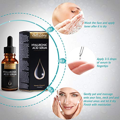 Belle Dairy Siero di acido ialuronico 1 oncia - Idratante viso biologico anti-invecchiamento con vitamina C, vitamina E per pelli secche e piccole rughe